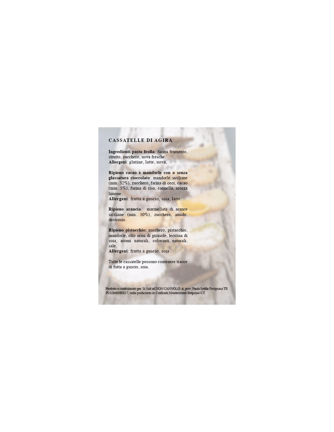 - Ingredienti ripieno cassatelle di Agira pistacchio: zucchero, farina di pistacchio siciliano (min. 18%), farina di mandorle siciliane, farina di frumento, acqua, pasta di pistacchio siciliano (min. 1%): pistacchi siciliani tostati, zucchero, mandorle siciliane tostate, olio di semi di girasole, lecitina di soia, aromi naturali, coloranti naturali, sale.