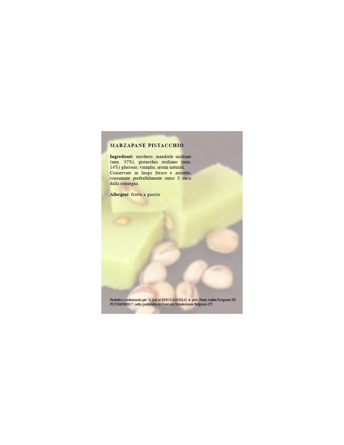 Ingredienti panetto per granita e latte di pistacchio: zucchero, mandorle siciliane (min. 37%), pistacchio siciliano (min. 13%), glucosio, vaniglia, aromi naturali. Allergeni: pistacchio, mandorle. Può contenere tracce di frumento e altra frutta a guscio. Consumare preferibilmente entro 3 mesi conservando in luogo fresco e asciutto.